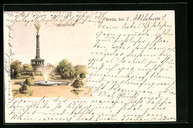 Lithographie Berlin-Tiergarten, Siegessäule mit Springbrunnen