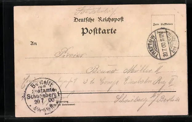 Personenbezogene Daten auf der Rückseite der Karte wurden durch blauen Textmarker unkenntlich gemacht. Die blauen Stellen sind auf die Vorderseite durchgeweicht und wirken sich negativ auf das Postkartenfoto aus