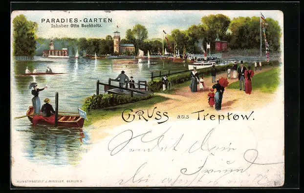 Lithographie Berlin-Treptow, Gasthaus Paradies-Garten, Inh. Otto Buchholtz