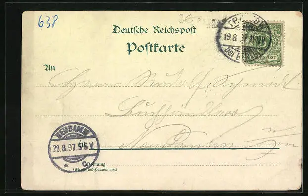 Personenbezogene Daten auf der Rückseite der Karte wurden durch blauen Textmarker unkenntlich gemacht. Die blauen Stellen sind auf die Vorderseite durchgeweicht und wirken sich negativ auf das Postkartenfoto aus