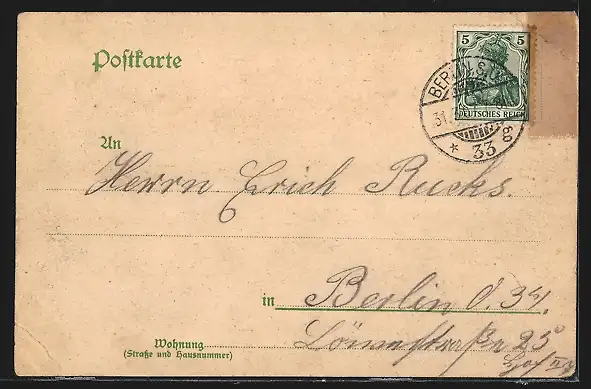 gelaufen 1907, Eckknick unten re., geklebter Eckknick oben li., guter Zustand