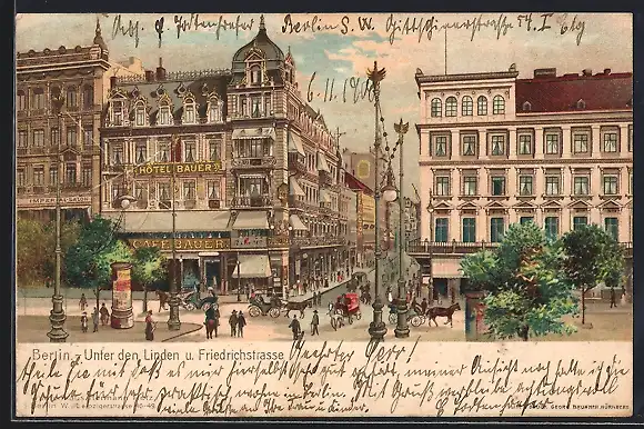 Lithographie Berlin, Unter den Linden, Blick in die Friedrichstrasse, das Cafe Bauer