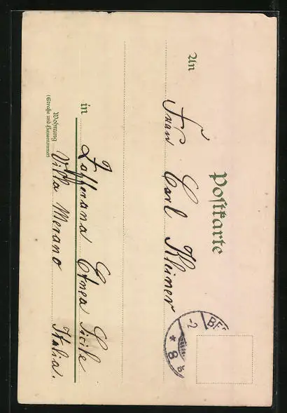 Personenbezogene Daten auf der Rückseite der Karte wurden durch blauen Textmarker unkenntlich gemacht. Die blauen Stellen sind auf die Vorderseite durchgeweicht und wirken sich negativ auf das Postkartenfoto aus