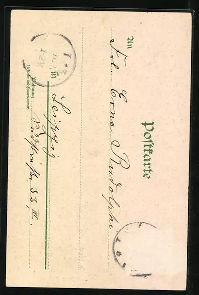 Personenbezogene Daten auf der Rückseite der Karte wurden durch blauen Textmarker unkenntlich gemacht. Die blauen Stellen sind auf die Vorderseite durchgeweicht und wirken sich negativ auf das Postkartenfoto aus