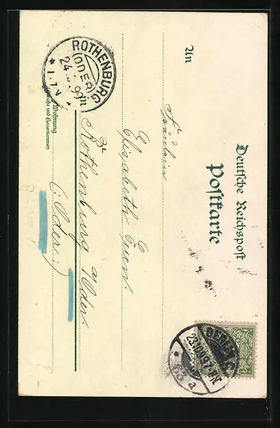 Personenbezogene Daten auf der Rückseite der Karte wurden durch blauen Textmarker unkenntlich gemacht. Die blauen Stellen sind auf die Vorderseite durchgeweicht und wirken sich negativ auf das Postkartenfoto aus