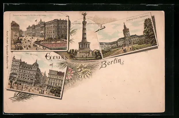 Lithographie Berlin, Unter den Linden, Siegessäule u. Schloss in Charlottenburg