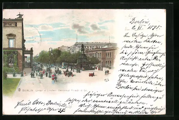Lithographie Berlin, Unter den Linden mit Denkmal Friedrich des Grossen