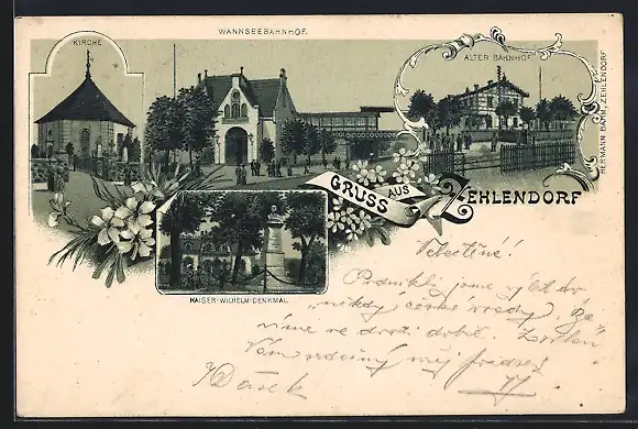 Lithographie Berlin-Zehlendorf, Wannseebahnhof, Alter Bahnhof, Kirche