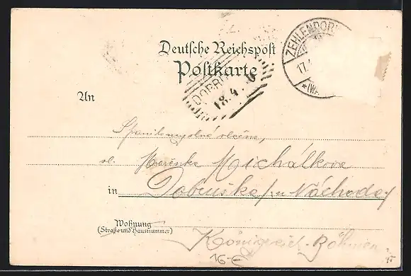 Personenbezogene Daten auf der Rückseite der Karte wurden durch blauen Textmarker unkenntlich gemacht. Die blauen Stellen sind auf die Vorderseite durchgeweicht und wirken sich negativ auf das Postkartenfoto aus
