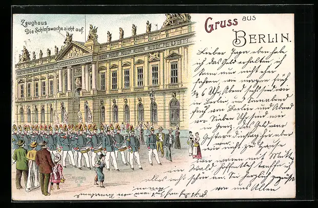 Lithographie Berlin, Zeughaus mit aufziehender Schlosswache
