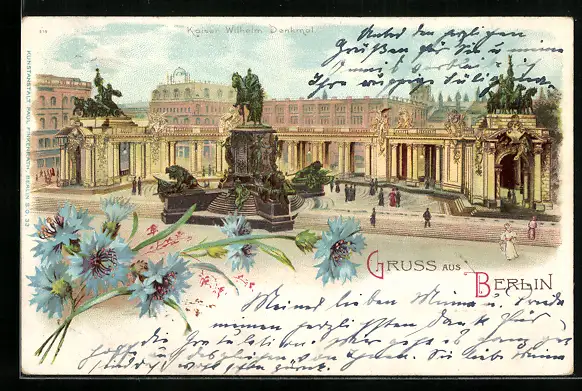 Lithographie Berlin, am Kaiser Wilhelm Denkmal, Blumenschmuck