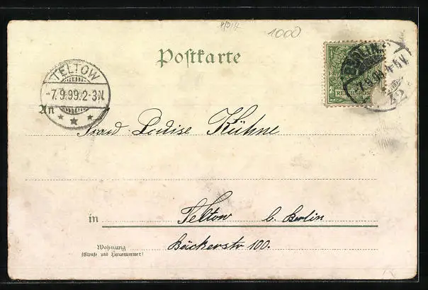 gelaufen 1899, Briefmarke entfernt, Eckknick oben re., Einriss oben mittig, guter Zustand