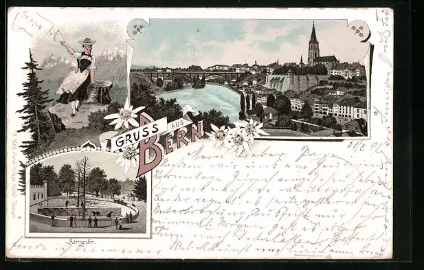 Lithographie Bern, Teilansicht mit Brücke, Bärengraben