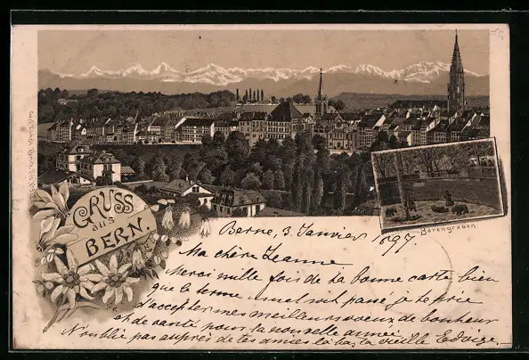 Lithographie Bern, Teilansicht mit Kirchen, Bärengrauen