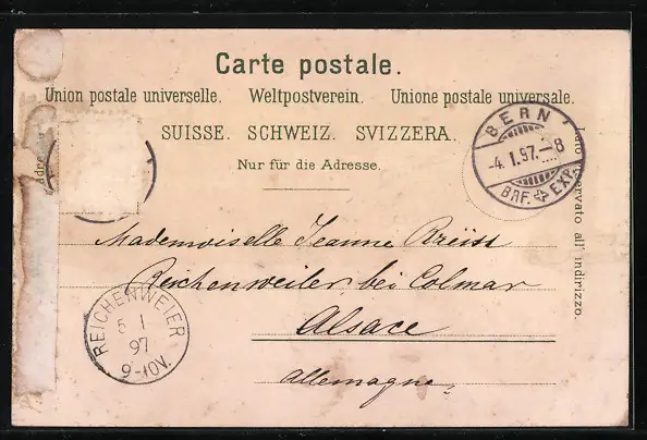 gelaufen 1897, Briefmarke entfernt, rückseitig Oberflächenschaden, rückseitig Klebe- und Papierreste, minimale Einrisse li. mittig u. unten, guter Zustand