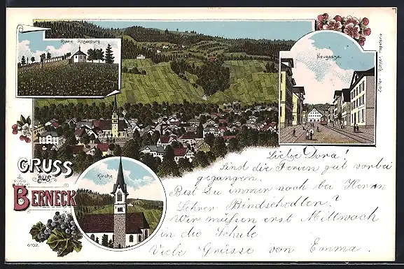 Lithographie Berneck, Kirche, Ruine Rosenburg, Neugasse
