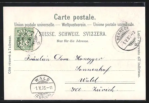 Personenbezogene Daten auf der Rückseite der Karte wurden durch blauen Textmarker unkenntlich gemacht. Die blauen Stellen sind auf die Vorderseite durchgeweicht und wirken sich negativ auf das Postkartenfoto aus