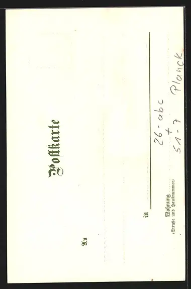 Personenbezogene Daten auf der Rückseite der Karte wurden durch blauen Textmarker unkenntlich gemacht. Die blauen Stellen sind auf die Vorderseite durchgeweicht und wirken sich negativ auf das Postkartenfoto aus