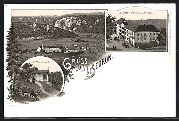 Lithographie Beuron, Gasthaus zum Pelikan, St. Markus Kapelle