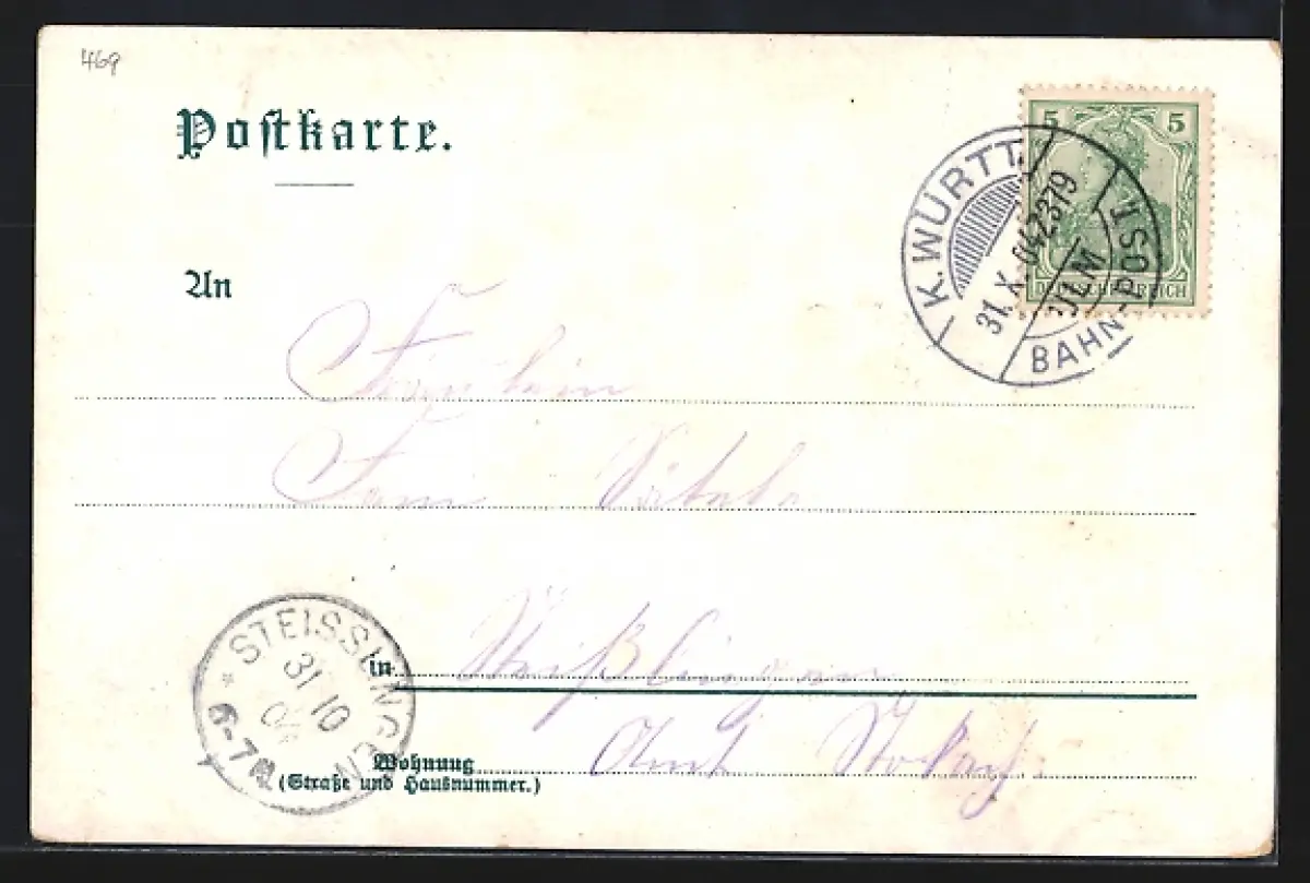 Personenbezogene Daten auf der Rückseite der Karte wurden durch blauen Textmarker unkenntlich gemacht. Die blauen Stellen sind auf die Vorderseite durchgeweicht und wirken sich negativ auf das Postkartenfoto aus
