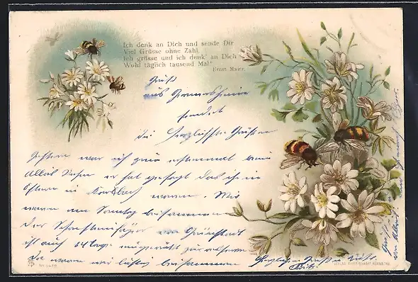 Lithographie Bienen an weissen Blumen, Grussreim
