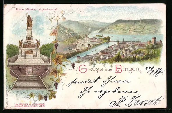 Lithographie Bingen, National-Denkmal a. d. Niederwald