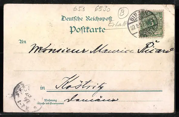 Personenbezogene Daten auf der Rückseite der Karte wurden durch blauen Textmarker unkenntlich gemacht. Die blauen Stellen sind auf die Vorderseite durchgeweicht und wirken sich negativ auf das Postkartenfoto aus