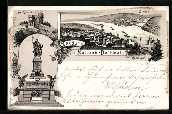 Lithographie Bingen, Nationaldenkmal, die Rossel, Ortsansicht