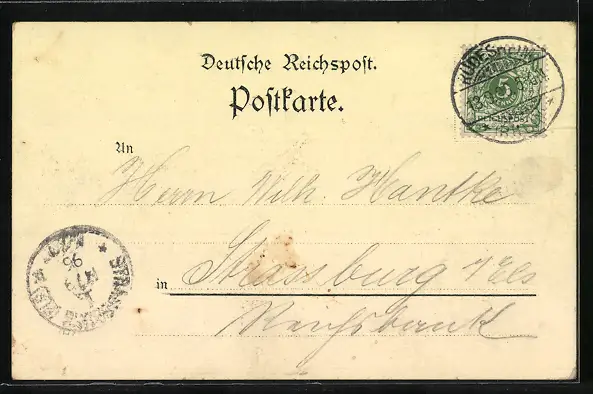 Personenbezogene Daten auf der Rückseite der Karte wurden durch blauen Textmarker unkenntlich gemacht. Die blauen Stellen sind auf die Vorderseite durchgeweicht und wirken sich negativ auf das Postkartenfoto aus