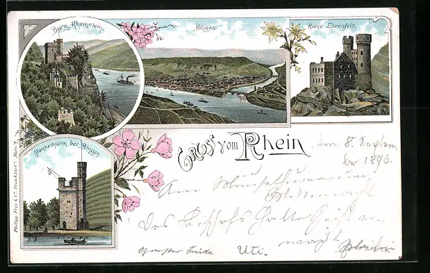 Lithographie Bingen, Ortsansicht, Mäusethurm, Ruine Ehrenfels