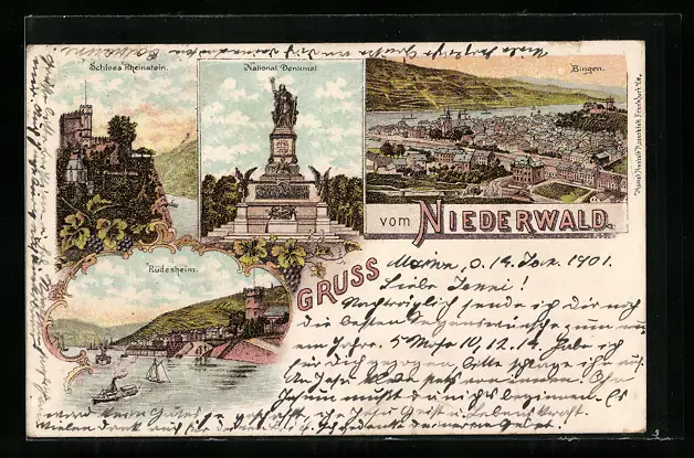 Lithographie Bingen / Rhein, Rüdesheim, Schloss Rheinstein, National-Denkmal