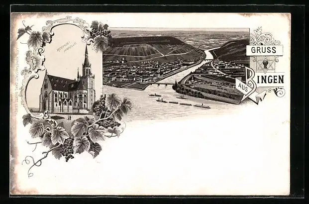 Lithographie Bingen, Teilansicht, Rochus-Kapelle