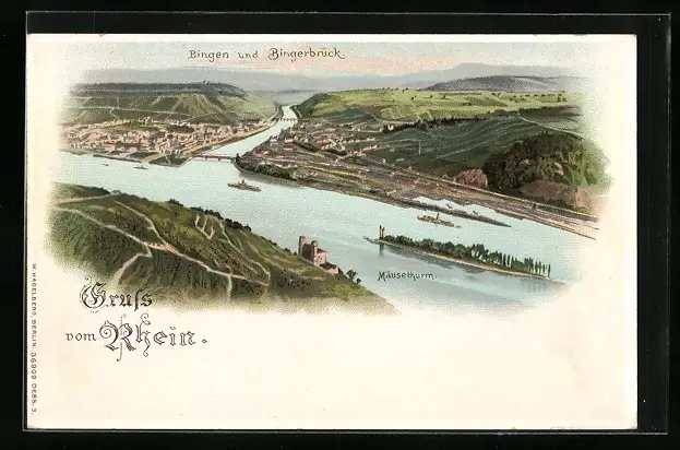 Lithographie Bingen, Teilansicht mit Bingerbrück und Mäuseturm