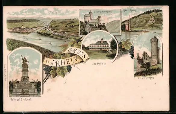 Lithographie Bingen, Totalansicht, National Denkmal, Jagdschloss