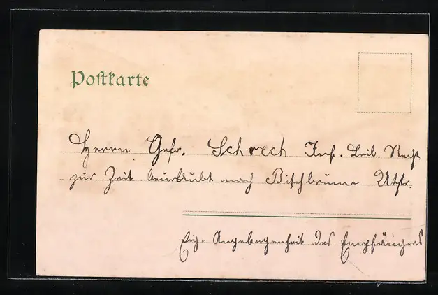 Personenbezogene Daten auf der Rückseite der Karte wurden durch blauen Textmarker unkenntlich gemacht. Die blauen Stellen sind auf die Vorderseite durchgeweicht und wirken sich negativ auf das Postkartenfoto aus