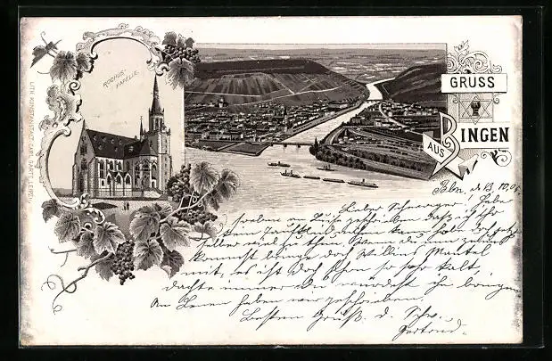 Lithographie Bingen a. Rh., Rochus Kapelle, Panorama