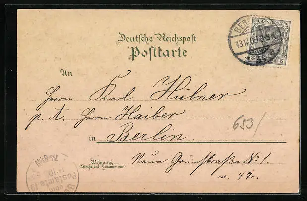 Personenbezogene Daten auf der Rückseite der Karte wurden durch blauen Textmarker unkenntlich gemacht. Die blauen Stellen sind auf die Vorderseite durchgeweicht und wirken sich negativ auf das Postkartenfoto aus