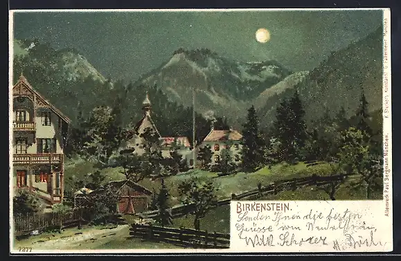 Lithographie Birkenstein, Ortspartie mit Kirche