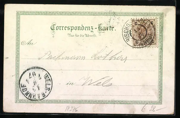 Personenbezogene Daten auf der Rückseite der Karte wurden durch blauen Textmarker unkenntlich gemacht. Die blauen Stellen sind auf die Vorderseite durchgeweicht und wirken sich negativ auf das Postkartenfoto aus