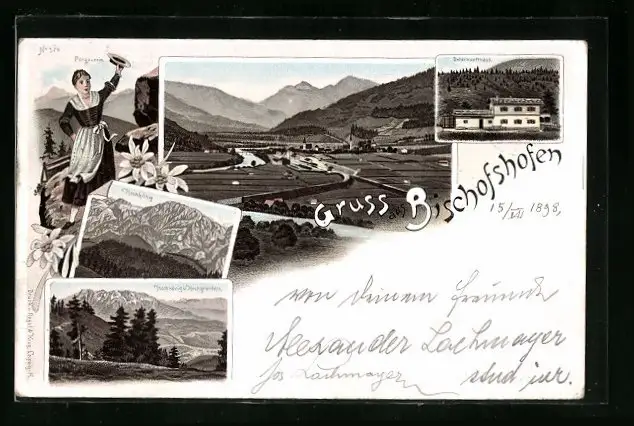 Lithographie Bischofshofen, Ortsansicht mit Pongauerin und Hochkönig