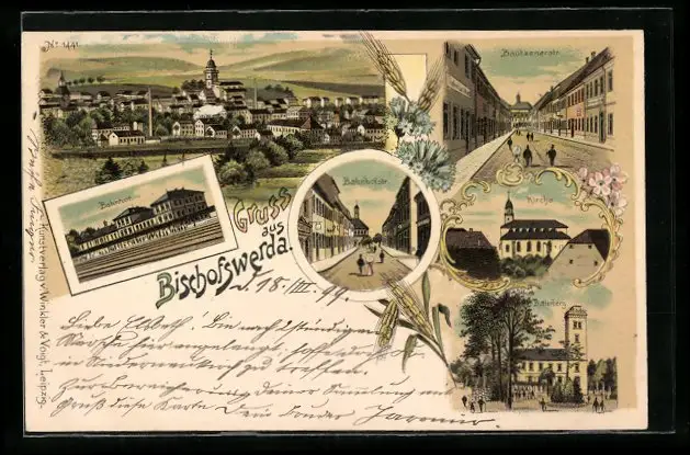 Lithographie Bischofswerda, Gasthaus Butterberg, Bahnhof, Kirche
