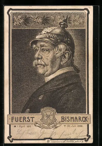 Lithographie Bismarck, Seitenportrait mit Pickelhelm, Wappen