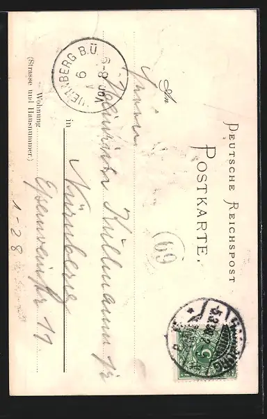 Personenbezogene Daten auf der Rückseite der Karte wurden durch blauen Textmarker unkenntlich gemacht. Die blauen Stellen sind auf die Vorderseite durchgeweicht und wirken sich negativ auf das Postkartenfoto aus