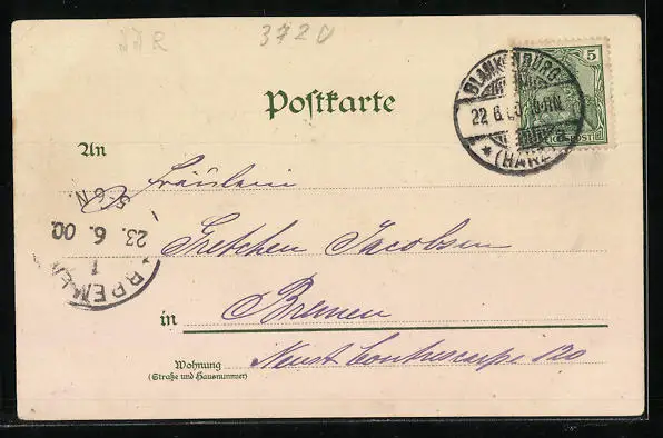 Personenbezogene Daten auf der Rückseite der Karte wurden durch blauen Textmarker unkenntlich gemacht. Die blauen Stellen sind auf die Vorderseite durchgeweicht und wirken sich negativ auf das Postkartenfoto aus