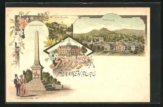 Lithographie Blankenburg /Thür., Fürst Georg-Denkmal, Ruine Greifenstein