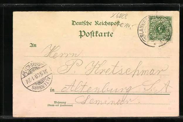 Personenbezogene Daten auf der Rückseite der Karte wurden durch blauen Textmarker unkenntlich gemacht. Die blauen Stellen sind auf die Vorderseite durchgeweicht und wirken sich negativ auf das Postkartenfoto aus