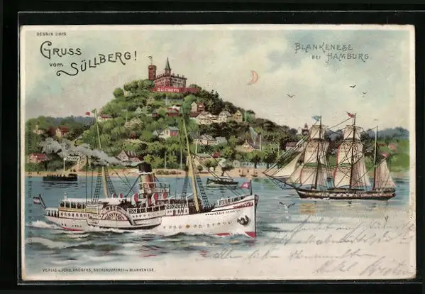 Lithographie Blankenese, Süllberg mit Dampfer und Segelschiff