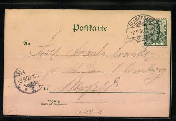 Personenbezogene Daten auf der Rückseite der Karte wurden durch blauen Textmarker unkenntlich gemacht. Die blauen Stellen sind auf die Vorderseite durchgeweicht und wirken sich negativ auf das Postkartenfoto aus
