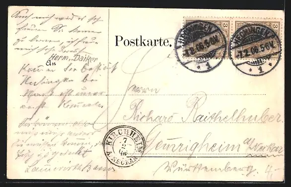 Personenbezogene Daten auf der Rückseite der Karte wurden durch blauen Textmarker unkenntlich gemacht. Die blauen Stellen sind auf die Vorderseite durchgeweicht und wirken sich negativ auf das Postkartenfoto aus