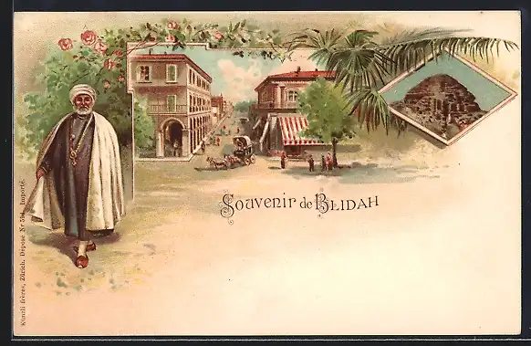 Lithographie Blidah, Strassenpartie im Zentrum, Reicher Araber in Tracht